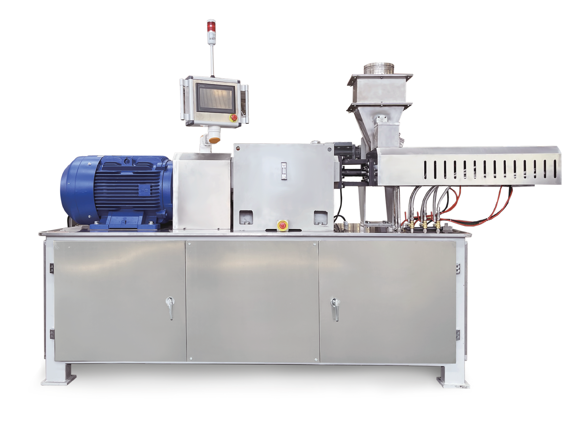 DLG系列單螺桿往復阻尼擠出機DLG系列系列單螺桿往復阻尼擠出機是一種多用途、高性能生產粉末混煉系統.也可用于其他產品的精細混合和分散。在螺桿高速旋轉和往復的復合運動下,臺運動下,物料被充分剪切、分散和混合。單螺桿擠出機的設計充分考慮了機器在高速運轉下的可靠性和安全性。先進的保護系統保證機器在最佳的狀態下運行,并對機器和操作者提供可靠的安全保護.